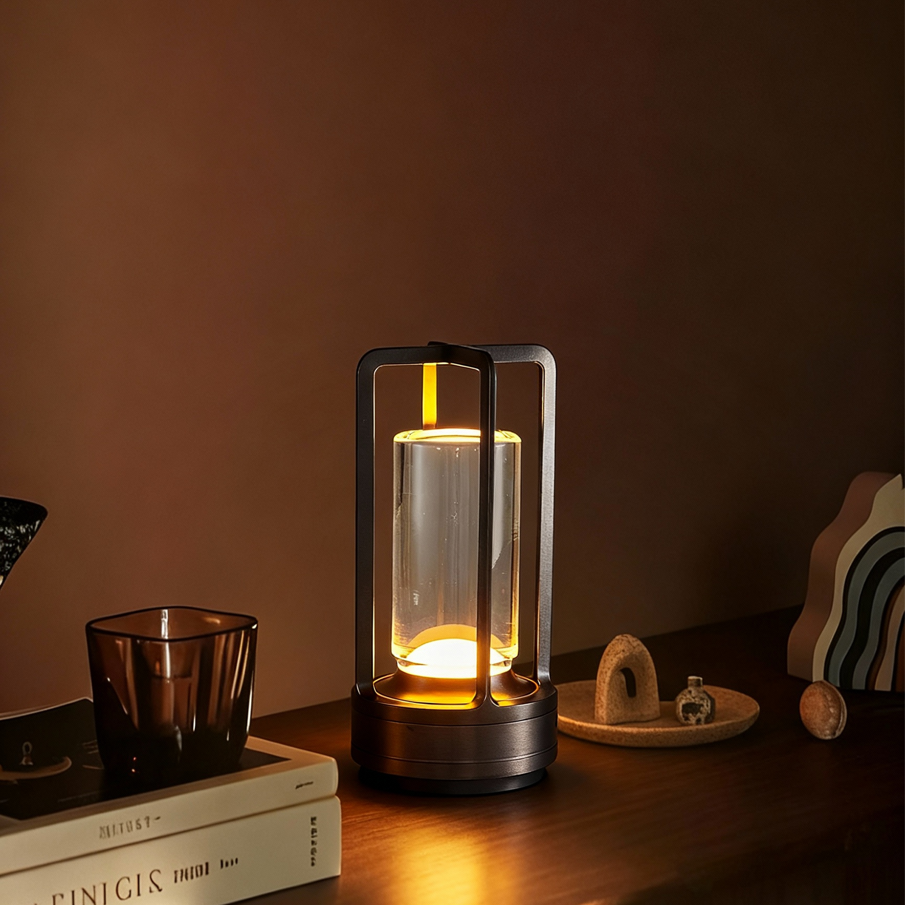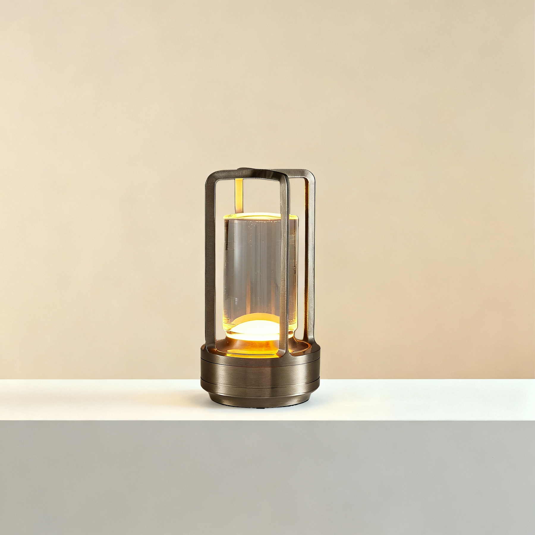 A modern reinterpretation of a classic lantern — the Vessel Glow captures light within a clear glass chamber, radiating gentle warmth into the space.
